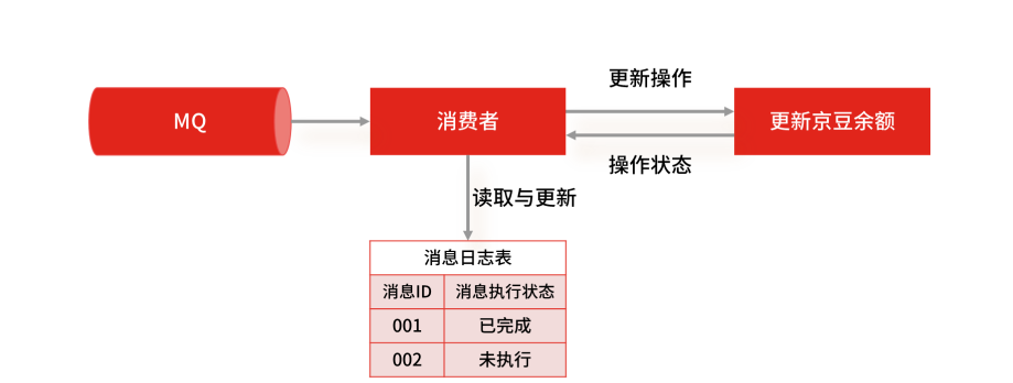 最简单的实现方案,就是在数据库中建一张消息日志表, 这个表有两个字段:消息 ID 和消息执行状态。这样,我们消费消息的逻辑可以变为:在消息日志表中增加一条消息记录,然后再根据消息记录,异步操作更新用户京豆余额