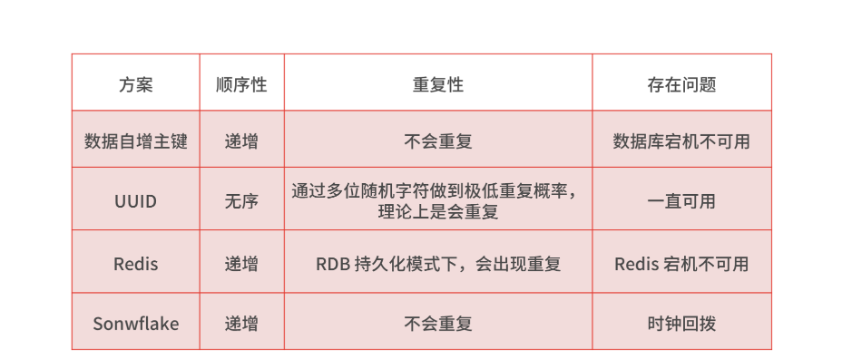 在分布式系统中,全局唯一 ID 生成的实现方法有数据库自增主键、UUID、Redis,Twitter-Snowflake 算法,总结了几种方案的特点,可以参考下