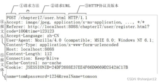 (2)HTTP请求消息报文格式包括: 请求行、请求头、请求体