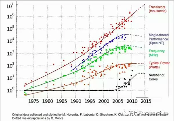 摩尔定律正在失效 第一个具有3.0GHz时钟速度的Pentium 4处理器是由英特尔于2004年推出的。 而今天,我的Mackbook Pro 2016的CPU时钟速度为2.9GHz。 可以看到在过去的十年中,CPU处理能力没有太大的进步。 您可以在下面的图表中看到这一点。