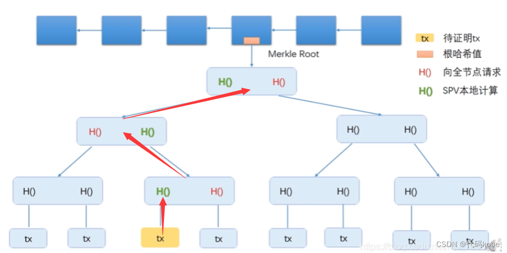 当需要向轻节点证明某条交易是否被写入区块链,便需要用到Merkle Proof。我们将该交易到根节点的这一路径称为Merkle Proof,全节点将整个Merkle Proof发送给轻节点,轻节点即可根据其算出根哈希值,然后与轻节点自身保存从根哈希值进行对比即可,从而验证该交易是否被写入区块链。
