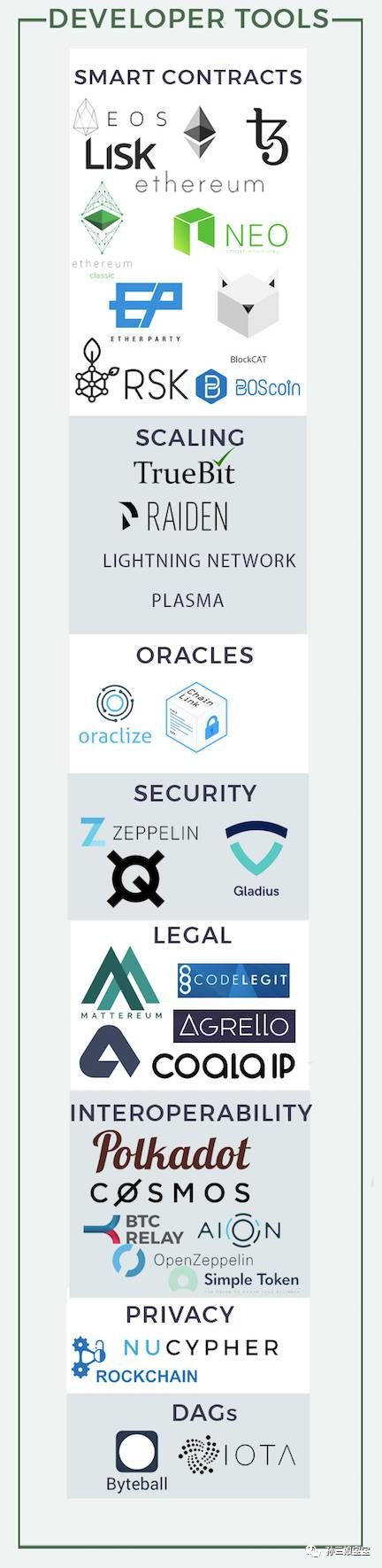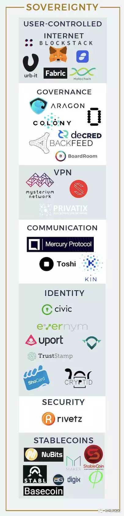 目前在改善区块链功能以及用户体验方面,有很多令人兴奋的项目。但是市场变化太快总有新项目发布,我们很难跟踪每个项目,并且区分哪个项目属于生态链系统,经常会出现“只见树木不见树林”的情况,所以我通过搜索研究以及业内朋友推荐,将关注的所有基于区块链去中心化项目整理成一个列表,并且输出为区块链市场格局图谱,一共七大类:货币、开发者工具、金融科技、价值交易、共享数据、主权、可靠性。