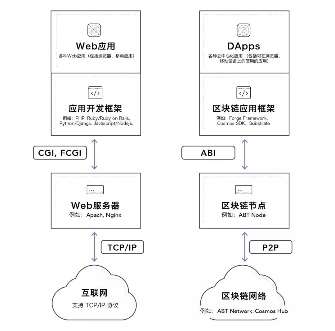 上图是区块链的应用和互联网的应用的比较,可以看出来两者其实有非常高的相似性,区块链的应用的架构并没有大家想象的那么复杂。