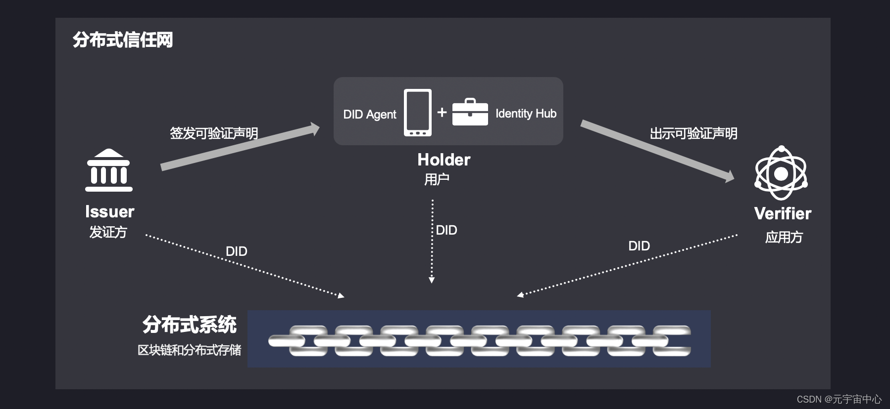 宏观上,DID 是一个动词,指的是用户、发证方和应用方在区块链上的交互过程。微观上,DID 是一个名词,指的是一串由数字和大小写字母组成的字符串,作为这三者在区块链上的身份标识。