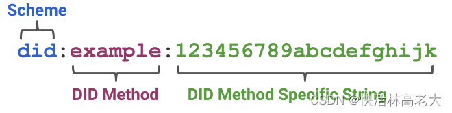 中间的example:被称为DID方法,用来表示是用哪一套方案(方法)来进行定义和操作的。可以自定义,比如腾讯旗下FISCO BCOS的DID标识为 tdid,Hyperledger Indy的标识为 indy,更多的请参考W3C的网站(