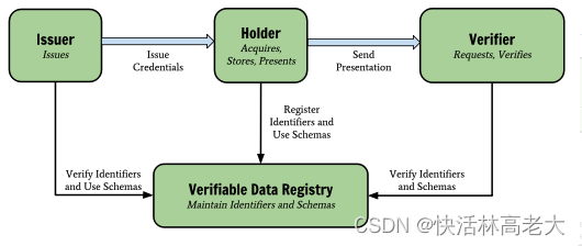 证书颁发者是一个权威机构,比如某大学、公安机关等;持有者会保存权威机构发布的凭据VC(比如从大学拿到的毕业证,公安机关拿到的身份证等);验证者会对这些凭据的表示(VP),并结合区块链上的信息进行验证。