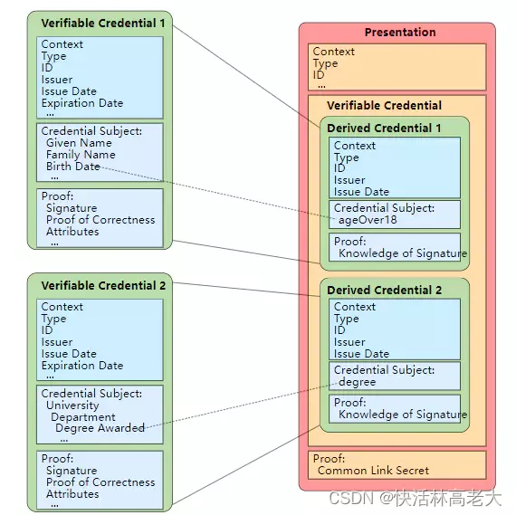 用户拥有的凭据中涉及很多私密信息,比如年龄(女生最不愿意让别人知道的)、收入等,这些都不能直接给别人看,但很多情况下又必须要验证这些信息,比如下图中的年龄范围(ageOver 18)、在学校是否获得过奖学金(degree),这些都是从原始VC中推导出来的,但为了保证推导过程的正确性,就必须附带零知识证明ZKP proof一同存放在VP中。