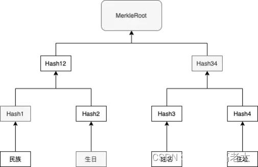 但如何确认披露的这几项是正确的,没有被修改过呢?这里用到了经典的Merkle Tree结构,如图5所示。比如在只需要披露生日的场景下,就可以借用”生日“的兄弟选项”民族“,以其到树根的路径<Hash1, Hash34> + MerkleRoot 来验证”生日“的正确性。