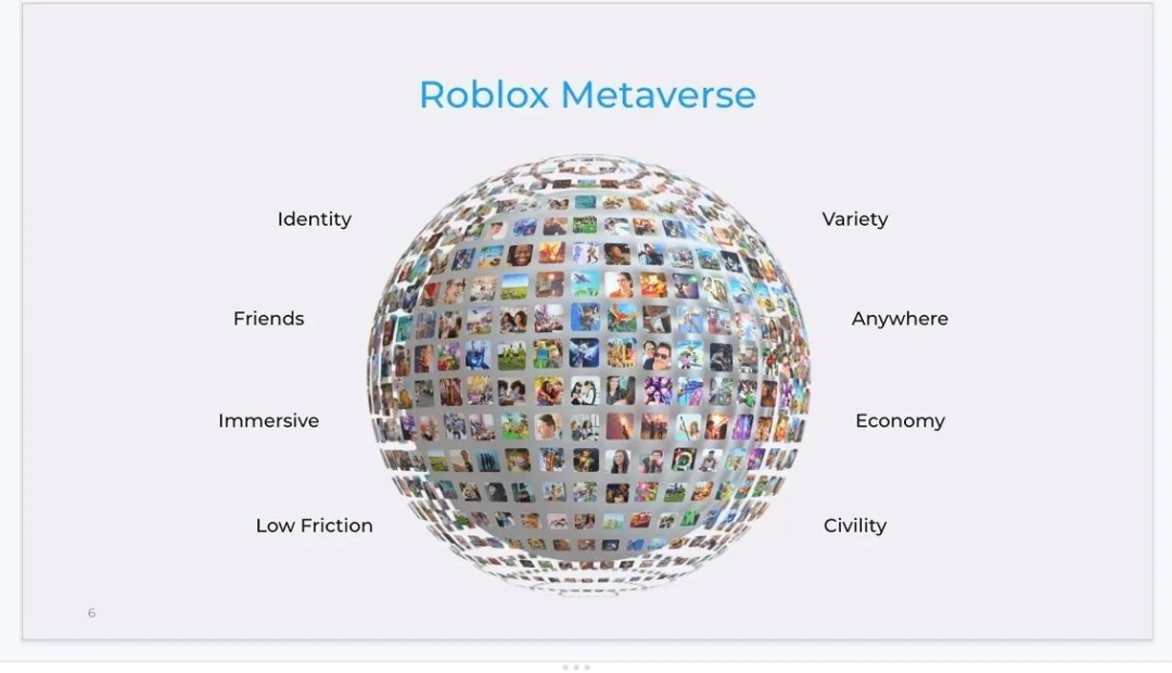 Roblox则认为,一个真正的元宇宙产品应该具备八大要素:身份、朋友、沉浸感、低延迟、多元化、随地、经济系统、文明。