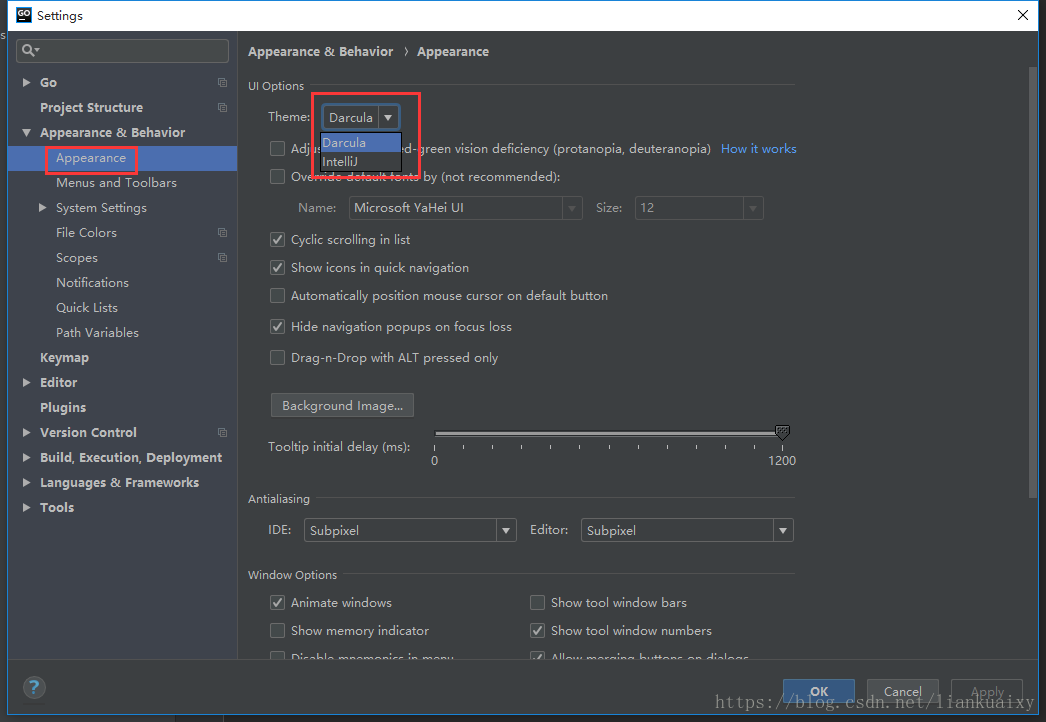 单击顶端的GoLand----->单击“Preferences”----->在左上角的搜索区输入“Appearance”,如图31所示------>单击“Apply”------>单击“ok”。