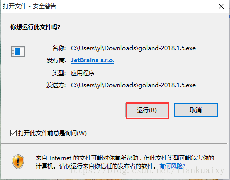 a. 双击“goland-2018.1.5.exe”,单击“运行”,如图1所示;