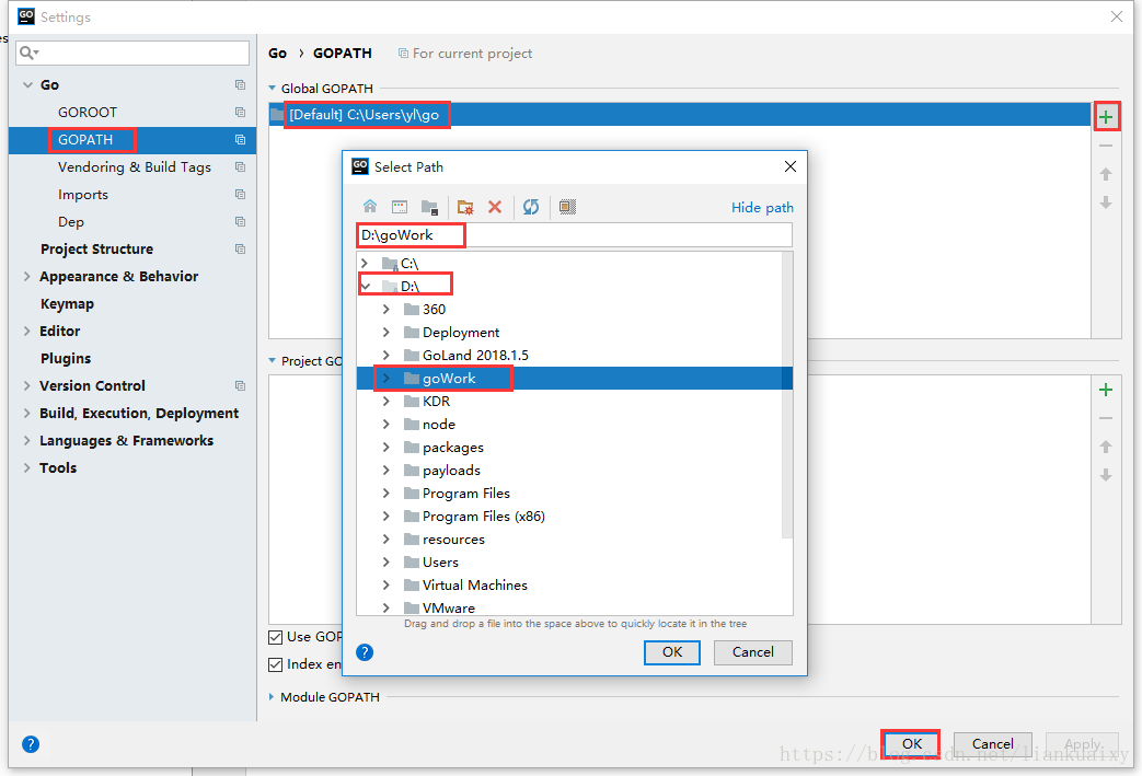 GoLand一般默认GOPATH路径是用户目录。但GOPATH可自定义路径,如图13所示,在D盘建立文件夹goWork,将Global GOPATH设置为D:goWork,如图14。