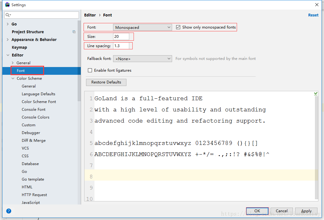 单击顶端的GoLand----->单击“Preferences”----->在左上角的搜索区输入“Font”,如图30所示------>单击“Apply”------>单击“ok”。