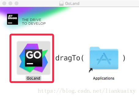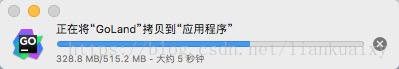a.双击goland-2018.1.5.dmg,出现如图19所示界面,用鼠标单击GoLand图标不放,将 GoLand拖拽到Applications位置处,如图20所示,这个时候会弹出如图21所示的界面;