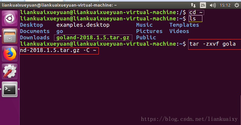 d. 通过命令行将文件“goland-2018.1.5.tar.gz”解压,并将安装文件保存到家目录下,如图32所示,输入命令: