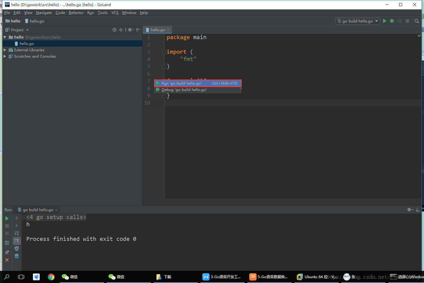 方式一:如图17所示,选中并右击要运行的程序------>单击“Run ‘go build hello.go’”;