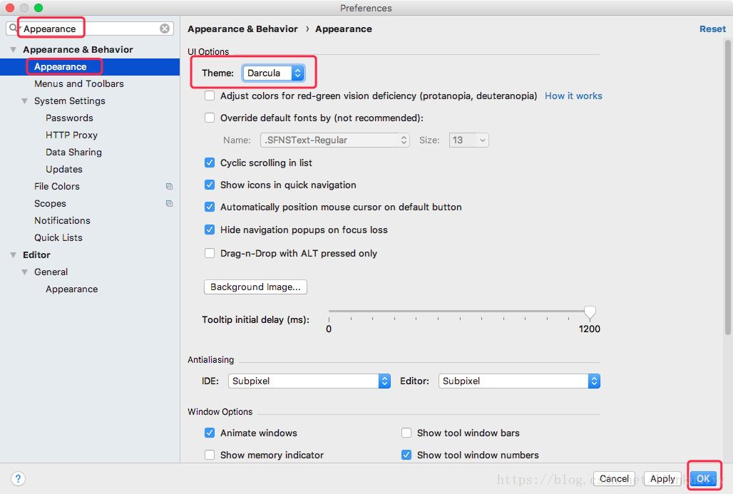 单击“File”------>单击“Settings”,如图11所示------>单击“Appearance”,如图16所示------>单击“Apply”------>单击“ok”。