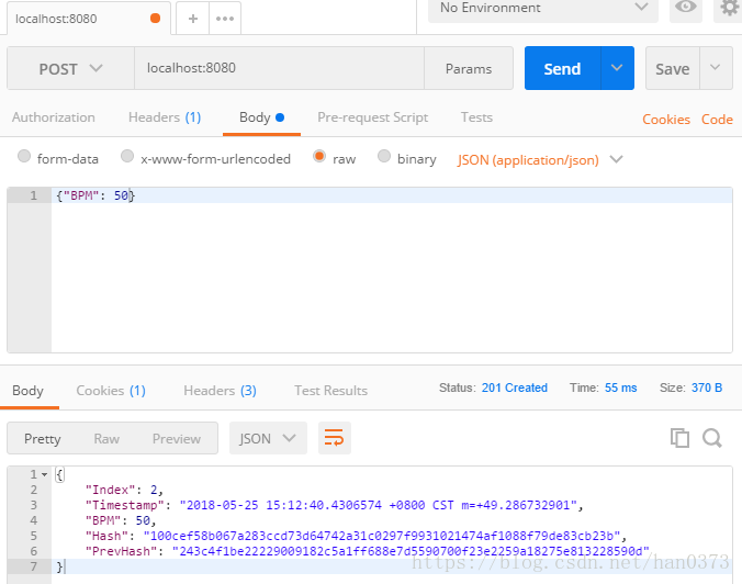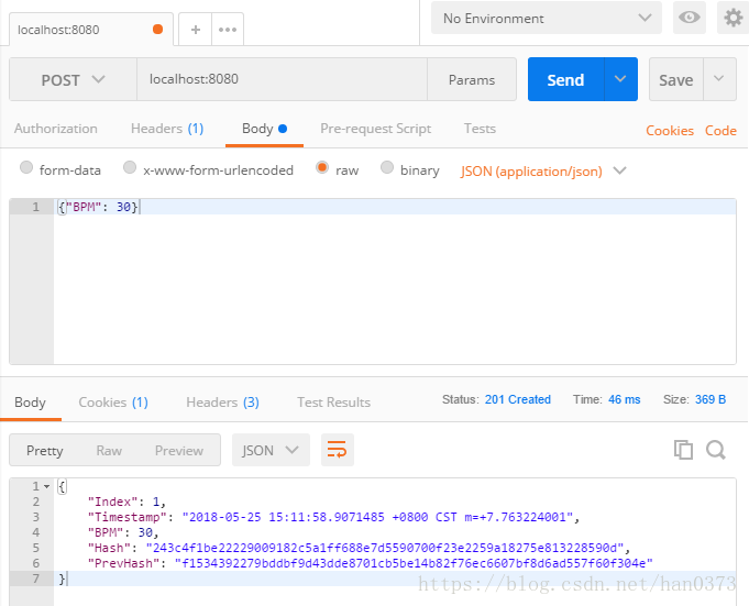 在这里定义Message类,实现的一个逻辑就是,添加新块时,使用POST请求,传入BPM脉搏信息来创建区块。