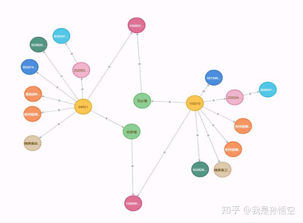 那么图谱可视化分析在实际业务场景能做什么?个人经验之谈,最重要的一点:案件排查。信贷场景、交易反欺诈等场景银行端的数据量和数据维度非常充足,构建的图谱自然是十分庞大复杂。图谱的分析首先得找到切入点,通常是有风险的客户、账户,进而关联出对应的公司、电话、家庭地址、设备等其他实体。通过从案件节点入手,利用图谱研究欺诈分子间的关联关系,顺藤摸瓜识别出其他可疑分子。利用图谱进行案件排查还有可能发现风险群体之间的特殊关联模式,典型的有传销账户金字塔结构,洗钱账户金字塔和倒金字塔结构。还有一些非常见的模式,如下图所示,两个客户(黄色节点)通过联系人(绿色节点)和联系电话(粉色节点)形成了交叉匹配关联,利用传统数据分析很难发现这种没有任何直接共同节点关联的联系。图谱可视化分析对解释团伙关联风险,理解作案手法起到巨大作用。遗憾的是就目前而言,这个过程无法实现自动化,非常依赖分析人员的技术和业务水平,有着一定的使用门槛。风控业务人员关心的是技术产出的结果,花钱采购了一个宣传得NBHH产品,然而还要求自己学习新技术才能使用,不能够自动产出风险名单,这种赔了夫人又折兵吃力不讨好的事甲方可不干。