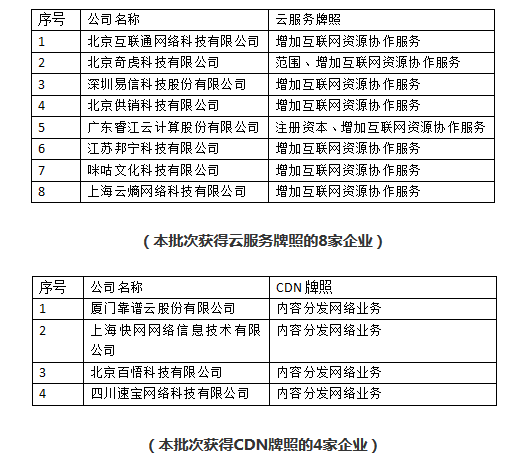 2018年1月19日上午9时,工信部发布“领取《中华人民共和国增值电信业务经营许可证》通知-(2018)第01批”,其中奇虎360、睿江云等8家企业获得云服务牌照,靠谱云、快网网络等4家企业获得CDN牌照。获得互联网资源协作服务(云服务牌照)、内容分发业务(CDN牌照)企业如下:
