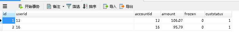 (1)账户基本信息表cust_accountbase-----包含用户ID, 账户ID, 余额amount, 冻结金额frozen, 账户状态custstatus