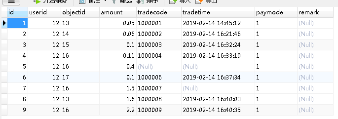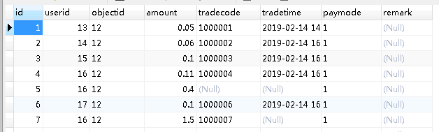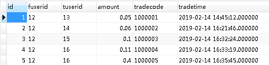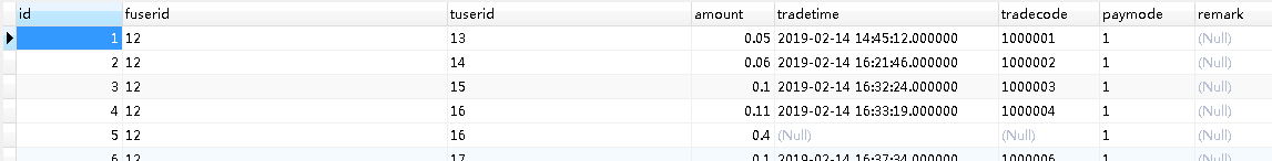 (4)交易流水表 trade_info----包含交易双方ID,交易金额, 交易码,交易时间---该表的记录插入主要由前台移动端发来的信息完成