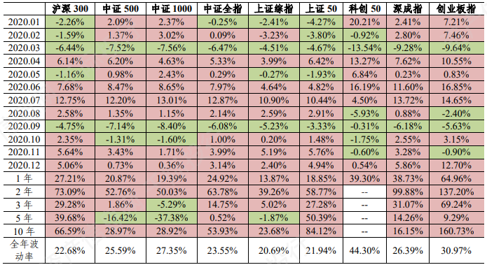 表 A 股市场表征指数 2020 年收益率