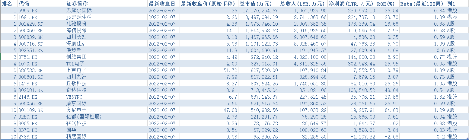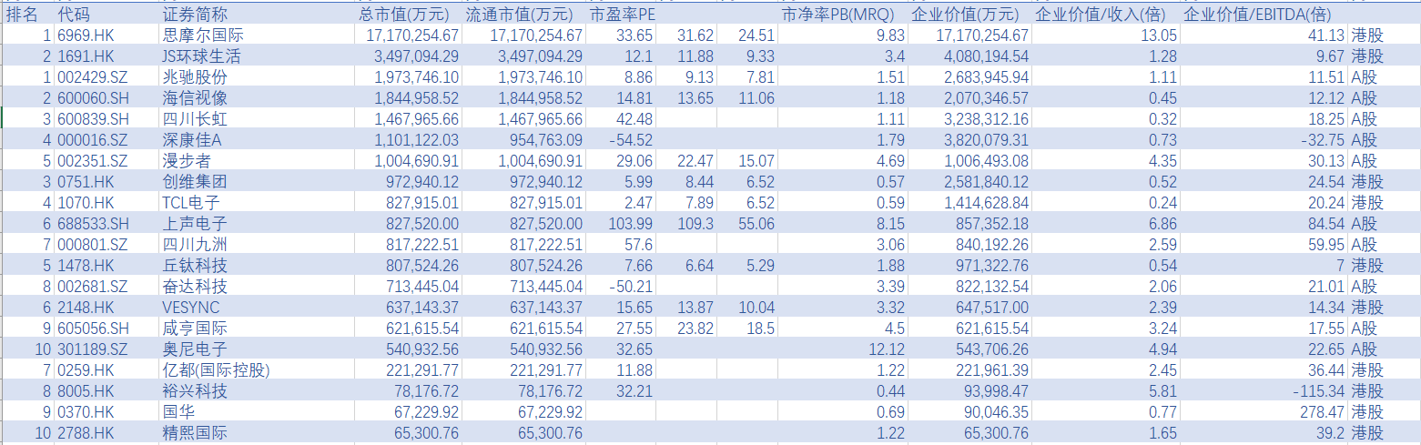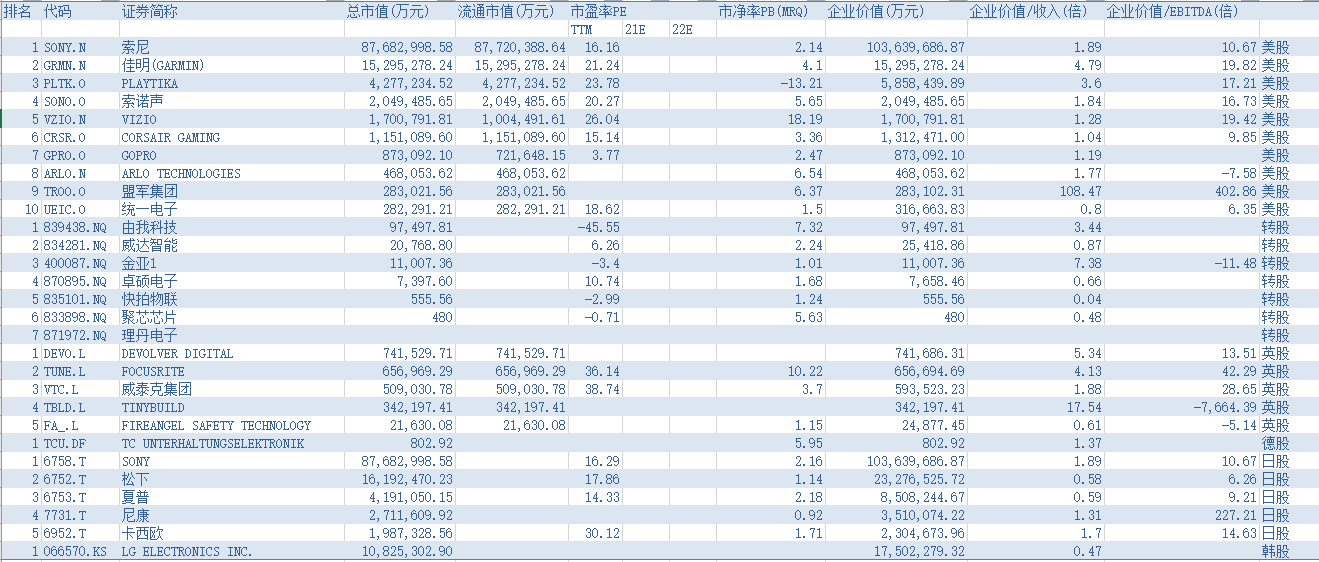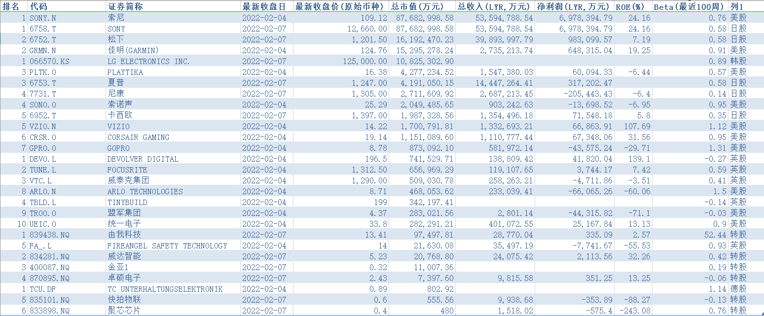 全球非中国主要企业有索尼 (SONY.N)、SONY (6758.T)、松下 (6752.T)、佳明 (GRMN.N)、LG ELECTRONICS INC. 066570.KS)、PLAYTIKA (PLTK.O)、夏普 (6753.T)、尼康 (7731.T)、索诺声 (SONO.O)、卡西欧 (6952.T)、VIZIO (VZIO.N)、CORSAIR GAMING (CRSR.O)、GOPRO (GPRO.O)、DEVOLVER DIGITAL (DEVO.L)、FOCUSRITE (TUNE.L)、威泰克集团 (VTC.L)、ARLO TECHNOLOGIES (ARLO.N)、TINYBUILD (TBLD.L)、盟军集团 (TROO.O)、统一电子 (UEIC.O)、由我科技 (839438.NQ)、FIREANGEL SAFETY TECHNOLOGY (FA_.L)、威达智能 (834281.NQ)、金亚 (400087.NQ)、卓硕电子 (870895.NQ)、TC UNTERHALTUNGSELEKTRONIK (TCU.DF)、快拍物联 (835101.NQ)、聚芯芯片 (833898.NQ)等。