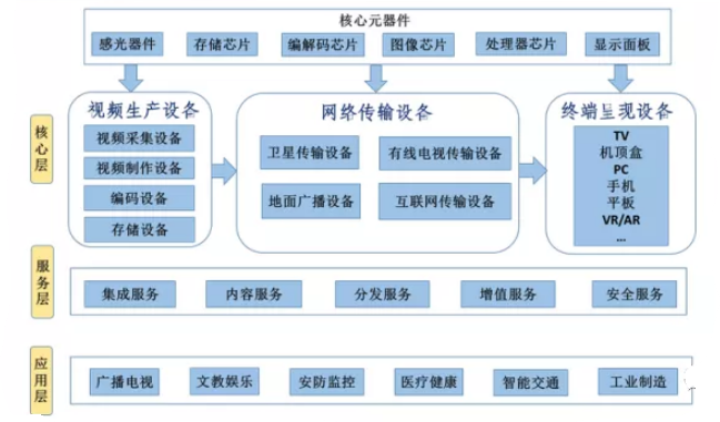 超高清视频产业链总体分为三个层次,即核心层、服务层和应用层。