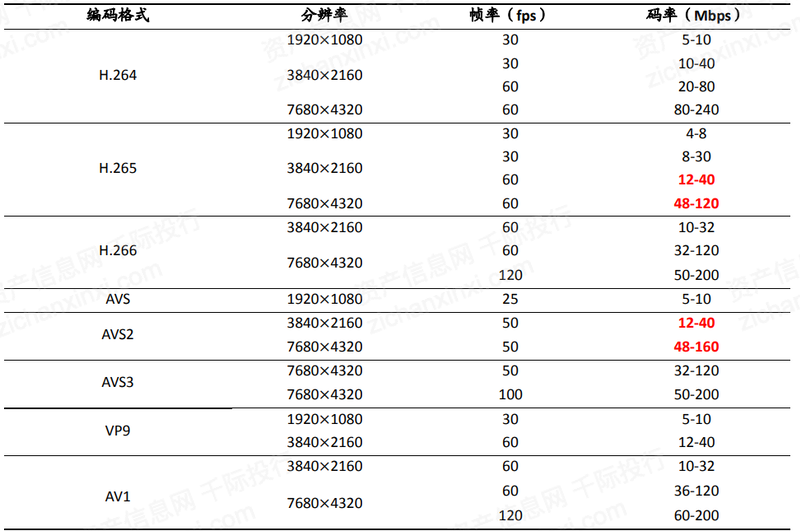 当前应用于 4k 超高清视频的主流编码是 H.265 和国产的 AVS2。 要实现 4K 内容播出,通常码率需要达到 30Mbps 以上。面向 8K 视频的编码格式 H.266、AVS3、AV1 也已在进程中。