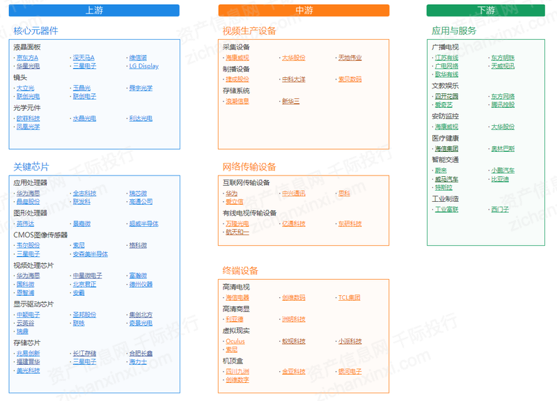 根据超高清视频陆续出台的行动规划来看,采集、制作、传输、表现作为超高清视频的四个核心环节均会受益,落地到电子板块,重点关注采集、传输、表现三个环节中芯片、显示面板、电视板块投资机遇。