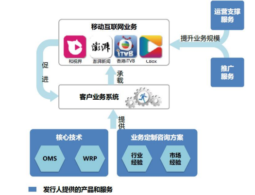 “技术+服务”的商业模式为移动互联网多媒体业务运营提供了完整的软件及服务支撑闭环。通过为客户提供业务流程再造、运营咨询、商业策划等咨询服务,协助客户建立一个完整的业务运营体系,减低客户业务转型风险。并充分发挥前、后端软件的协同效应,提高业务系统的运行效率,协助客户快速盈利。