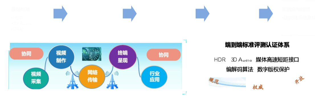 支持科研机构开展超高清视频标准顶层设计,鼓励上下游相关企业参与标准制定,建立从内容制作到终端播放的全流程超高清视频标准体系。加快制定高质量的内容制作、HDR、超高清音视频接口等重点标准,促进重点标准在大型和特色企业中的应用示范和宣贯,鼓励相关产品即使采用国际标准时也要为兼容国内标准提供接口。