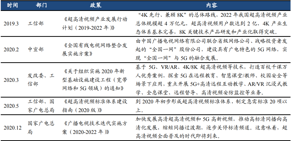 2020 年 12 月,国家广电总局发布《广播电视技术迭代实施方案(2020- 2022 年)》,超高清有望成为 5G 首个普及场景,到 2022 年底基本实现中央和省级卫视节目在直播卫星高清同播。