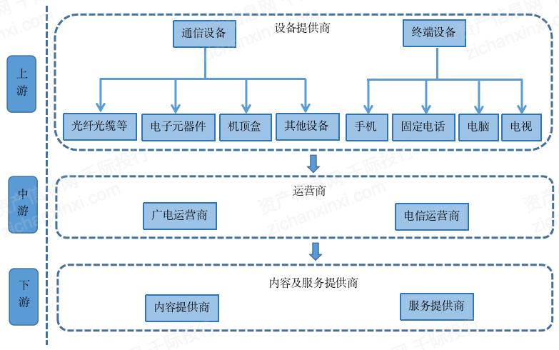 三网融合产业链上游是设备提供商,包括通信设备和终端设备提供商;中游是运营商,包括广电运营商和电信运营商;下游是内容及服务提供商,对消费者提供相应的服务。以芒果超媒为例,其属于产业链的下游。