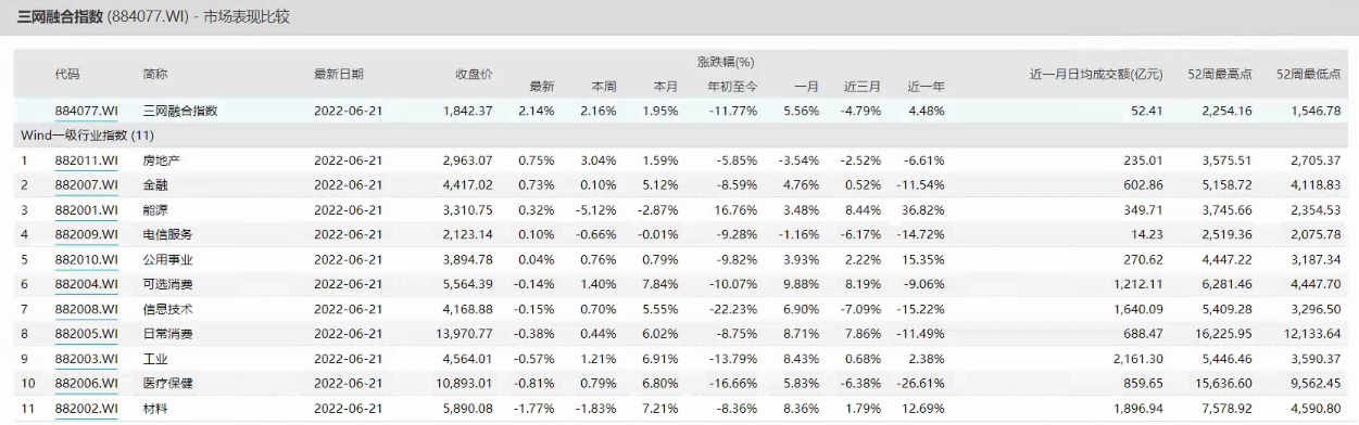 图 截至2022年6月21日,三网融合指数和Wind一级行业指数对比