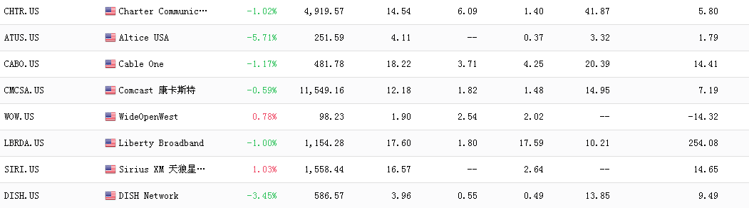 全球非中国企业有Charter Communications[CHTR.US]、Altice USA[ATUS.US]、Cable One[CABO.US]、Comcast[CMCSA.US]、WideOpenWest[WOW.US]等。