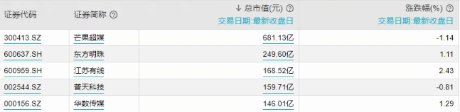 (1)东方明珠[600637.SH]:东方明珠新媒体股份有限公司主要从事IPTV、互联网电视、手机电视等新媒体业务运营。公司主要产品或服务包括影视互娱、媒体网络、视频购物、文旅消费、投资管理。公司蝉联“中国互联网企业100强”及“上海百强企业”,并连续9年入选中国“文化企业30强”。