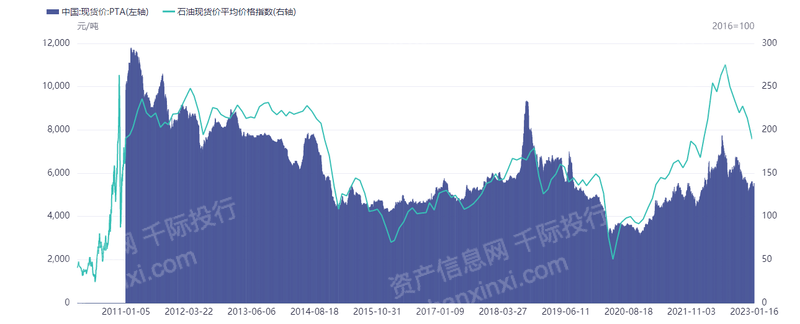 图 石油现货价平均价格指数与国内PTA现货价