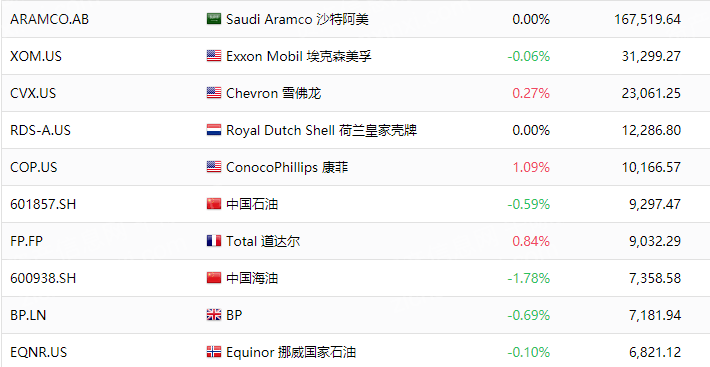 (1)Saudi Aramco 沙特阿美[ARAMCO.AB]:是一个有多年历史的综合国际石油公司,是世界最大的石油生产公司和世界第六大石油炼制商,业务遍及沙特王国和全世界。它主要从事石油勘探、开发、生产、炼制、运输和销售等业务,拥有世界最大的陆上油田和海上油田。2019年12月5日,沙特阿美以每股32里亚尔的价格发行股票,融资256亿美元,成为有史以来规模最大的IPO,该公司的估值达到1.7万亿美元,超过微软和苹果,成为市值最高的上市公司。
