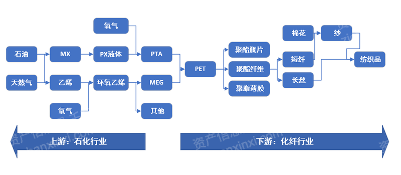 PTA行业是重要的中游行业,上游承接石化行业,下有衔接化纤行业。上游原材料以石油、天然气等石化资源与MX、PX液体等化工产品为主,下游行业中聚酯纤维和聚酯瓶片需求较大,整条产业链的传导作用自下而上,下游需求影响对PTA、PET和MEG等的产量,进而影响对上游原料的需求。