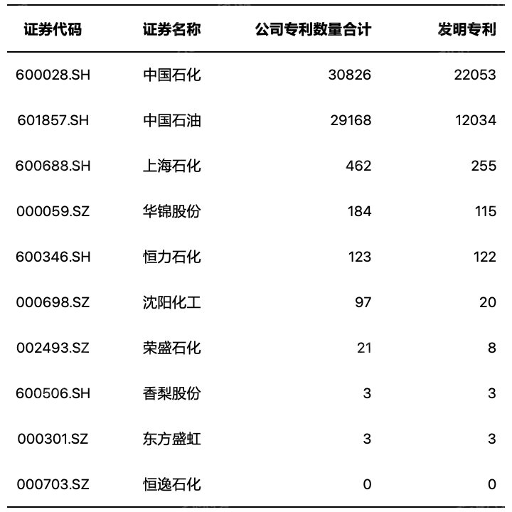 对国内PTA产业的各个专利申请人的专利数量进行统计,排名前十的公司依次为:中国石化、中国石油、上海石化、华锦股份、恒力石化、沈阳化工、荣盛石化、香梨股份、东方盛虹、恒逸石化。