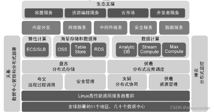 飞天内核跑在每个数据中心里面,它负责统一管理数据中心内的通用服务器集 群,调度集群的计算、存储资源,支撑分布式应用的部署和执行