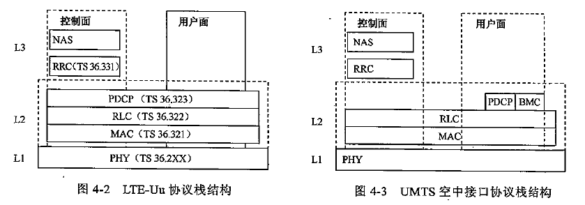 LTE和UMTS空口协议栈对比如下图。