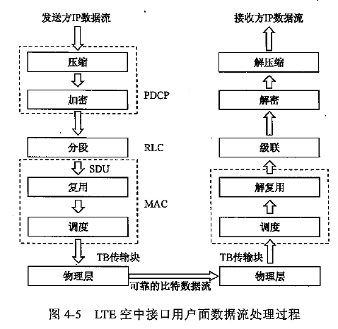 用户面的主要功能是处理业务数据。在发送端,将承载高层业务应用的IP数据流,通过头压缩(PDCP)、加密(PDCP)、分段(RLC)、复用(MAC)、调度等过程变成物理层可处理的传输块;在接收端,将物理层接收到的比特数据流,按调度要求,解复用(MAC)、级联(RLC)、解密(PDCP)、解压缩(PDCP),成为高层应用可识别的数据流,整个过程如图所示。