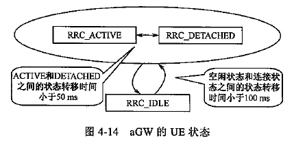 在eNodeB中,RRC_CONNECTED对应着aGW中的RRC_ACTIVE状态,无需保留RRC_DETACHED状态。这样,处于RRC_DETACHED(分离状态)的UE在核心网属于“在线(online)”状态,而在无线接入网侧则并不占用任何无线资源。