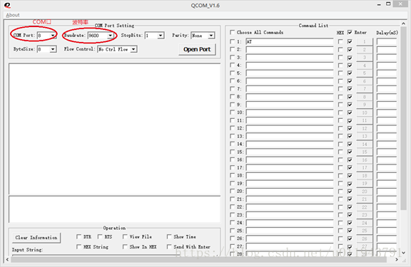 打开串口工具QCOM,软件下载点击打开链接。选择相应的COM口,我的是COM8,BC28模块出厂主串口波特率默认都是9600bps,所以这里波特率选9600,其他选项如下图默认。