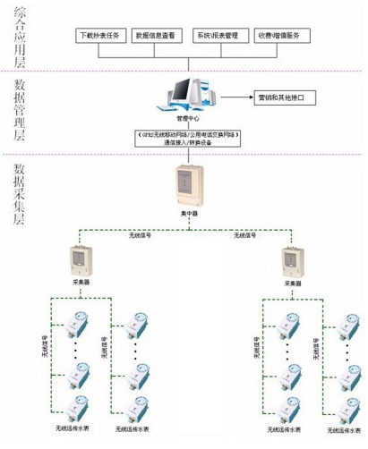 上图为远程抄表系统的一般架构模型,该系统具有极好的兼容性和扩展性,既可以实现对无线远传水电表进行管理,也可以实现水、电、气、暖表等多种类型智能表的综合管理。