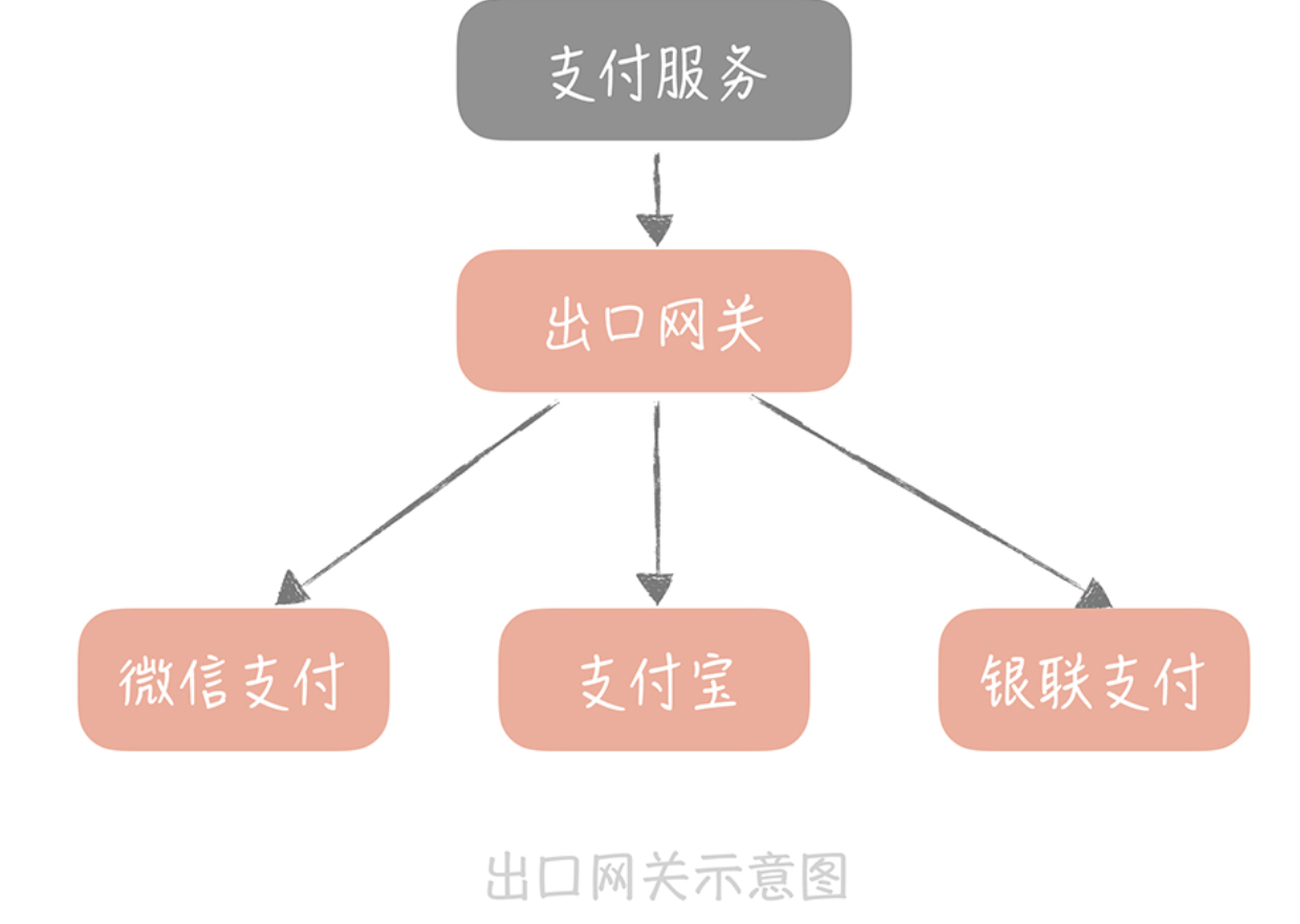 同时,我们可以在系统和第三方支付服务,以及登陆服务之间部署出口网关服务。原先,你会在拆分出来的支付服务中,完成对于第三方支付接口所需要数据的加密、签名等操作,再调用第三方支付接口,完成支付请求。现在,你把对数据的加密、签名的操作放在出口网关中,这样一来,支付服务只需要调用出口网关的统一支付接口就可以了。在引入了 API 网关之后,我们的系统架构就变成了下面这样: