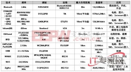 当今最流行的无线通信技术、应用、和规范示于表3,包括:各种无线通信技术的适